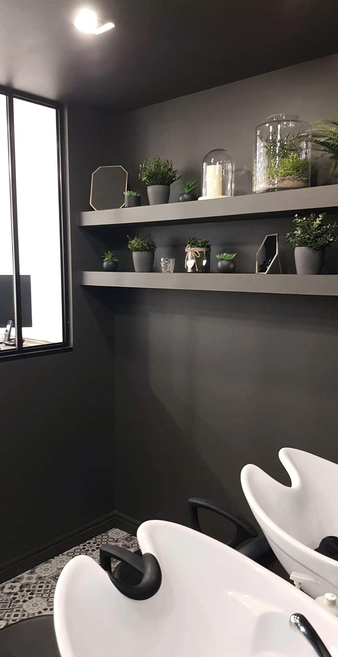 Les différents espaces de travail ont été entièrement repensés afin d'apporter beaucoup plus d'ergonomie et d'intimité à la clientèle, tout en optimisant les déplacements afin de gagner en efficacité et en temps de travail. La nouvelle configuration bénéficie désormais de 3 postes bien définis : le coin bac shampooing, le coin coiffure et l’espace d’accueil avec salon boudoir. Le coin bac se situe désormais dans une alcôve à l'abri des regards, et la banque d'accueil joue la délimitation visuelle avec l'espace coiffure, tout en conservant la perspective grâce à une semi-cloison surmontée d'une verrière atelier. Un faux plafond a été créé avec une différence de niveau accentuant le côté boudoir intimiste du coin bac.