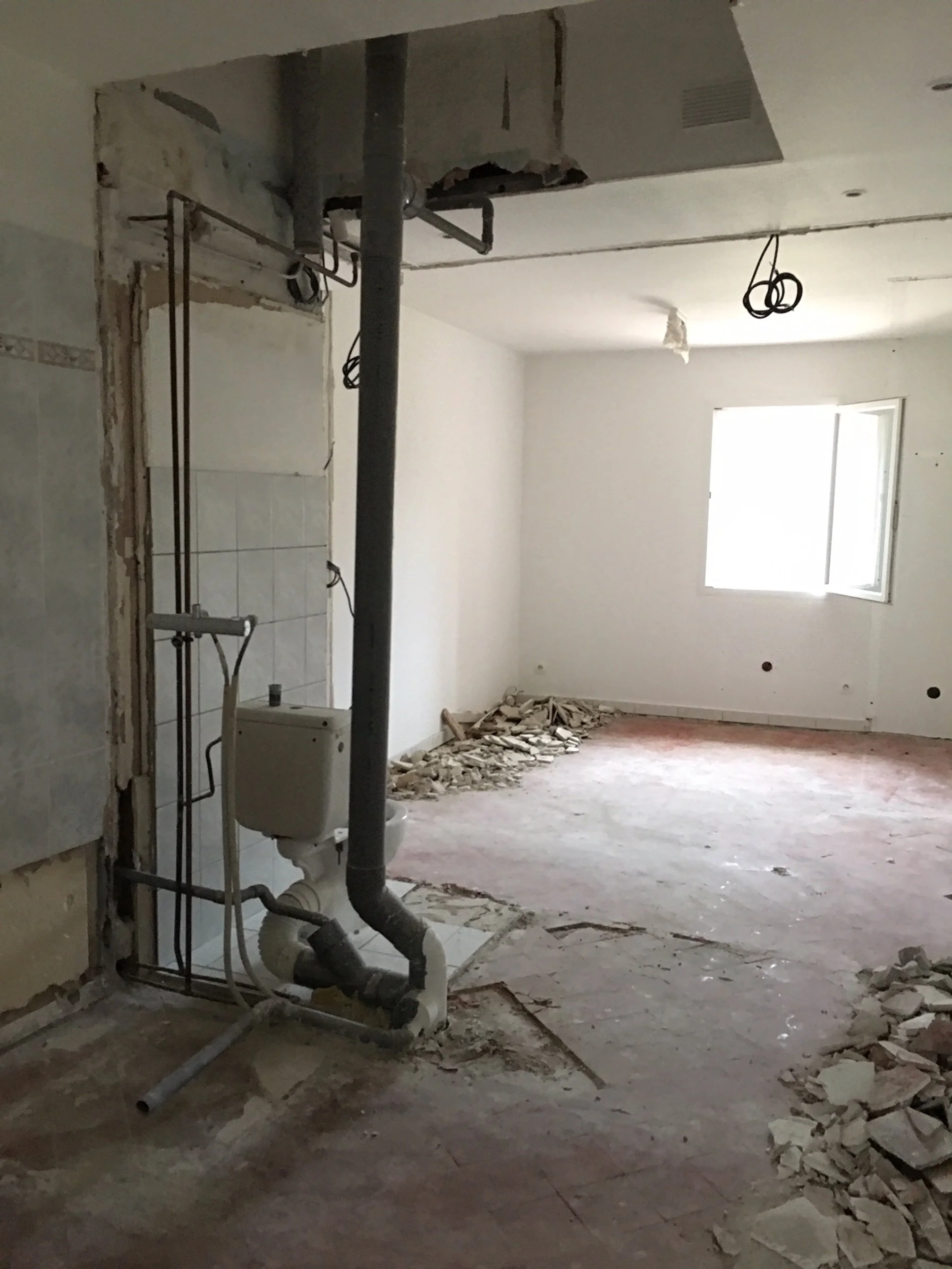 Repenser totalement l'espace d’un T3 de 72m2 d’un bâtiment de 1890, en optimisant au mieux l’espace avec la création d’une cuisine US ouverte sur la pièce de vie, d’un espace buanderie attenant, d’une salle d’eau avec WC intégré et de deux chambres tout en conservant le cachet de l’ancien.