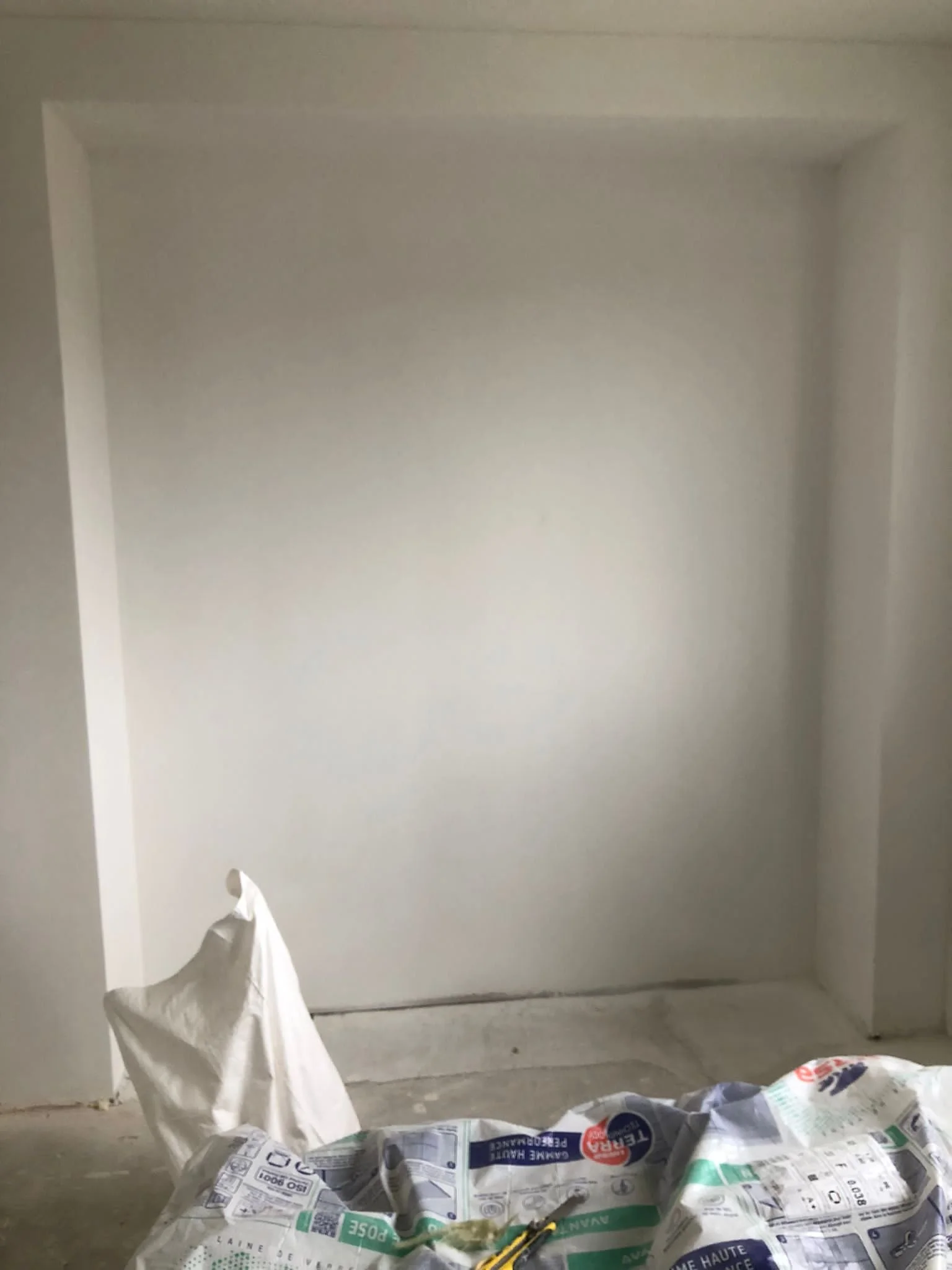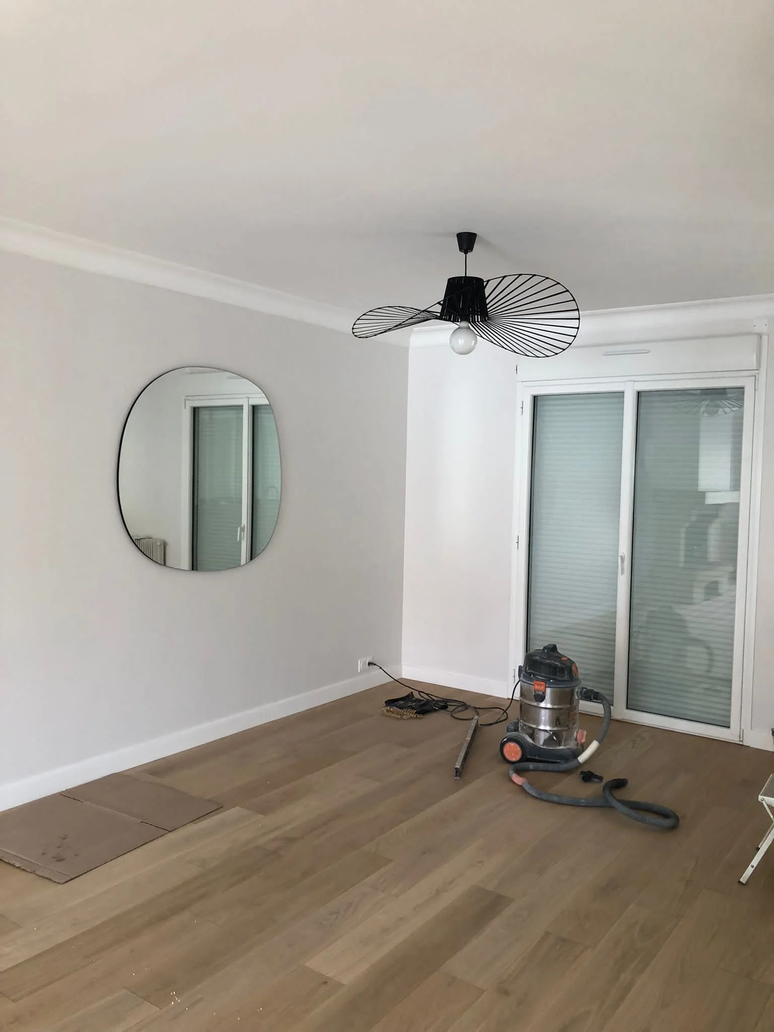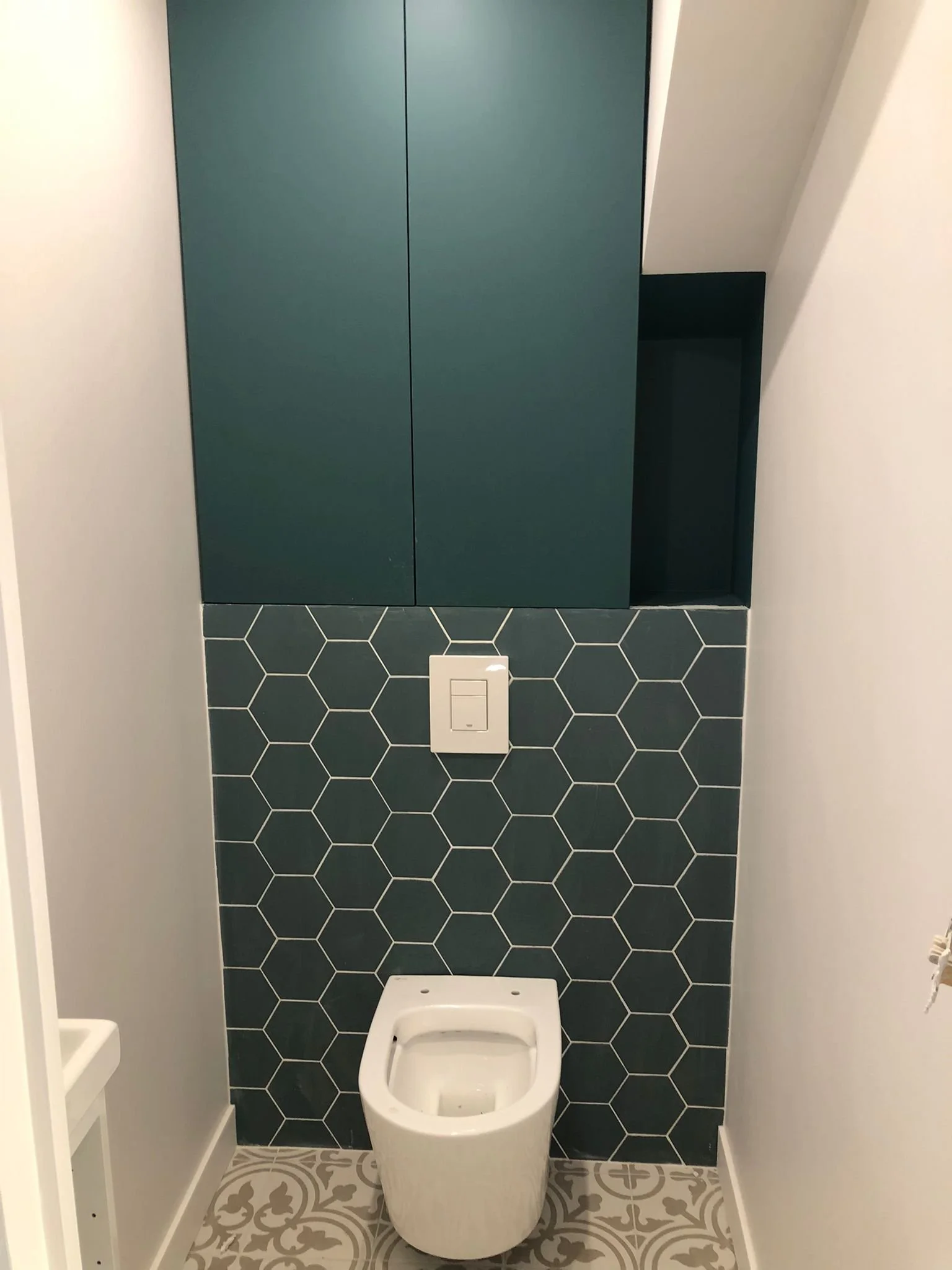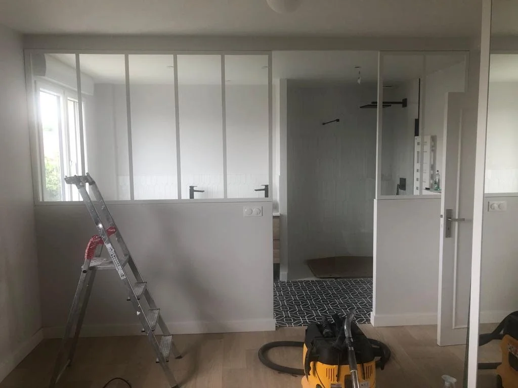 Côté suite parentale, les deux espaces salle de bain et chambre ont été réunis tout en conservant la séparation visuelle pour l'intimité mais en prolongeant la perspective et la lumière grâce à l'ajout de deux verrières en partie haute. Niveau chambre, une inspiration 30'S et scandinave avec un dressing de L250 x H236 x P60 cm ( modèle PAX ikea ) avec porte miroir, un coin coiffeuse et un bout de lit coffre pour rangement des coussins ( selon les désirs de la cliente ). Côté salle de bain : un espace WC suspendu, une douche à l'italienne de 80 x 160 cm, une baignoire ilot de 80 x 160 cm et un meuble double vasque ( gamme Neo chez Leroy merlin coloris Gris paris 2 ) de 120 cm. Un dressing côté chambre d'enfant attenante de L200 x H236 x P35 cm a été créé en empiétant sur l'ancienne salle de bain. Des niches maçonnées ont également été conçues dans l'ancien placard et font office d'espace bibliothèque et rangement pour les jouets.
