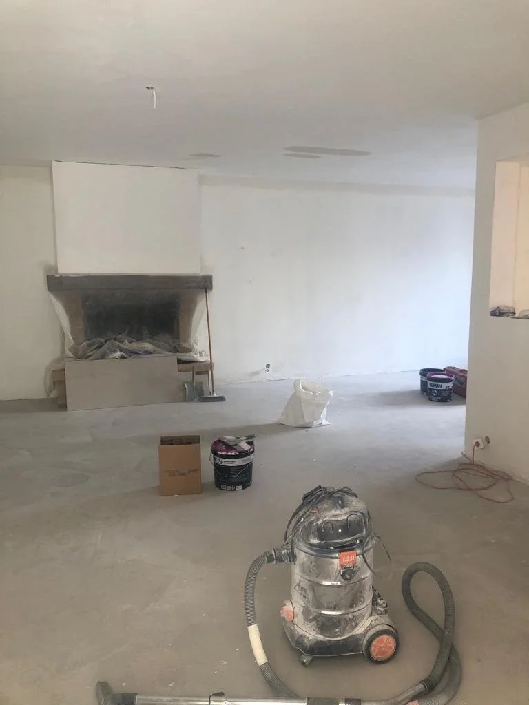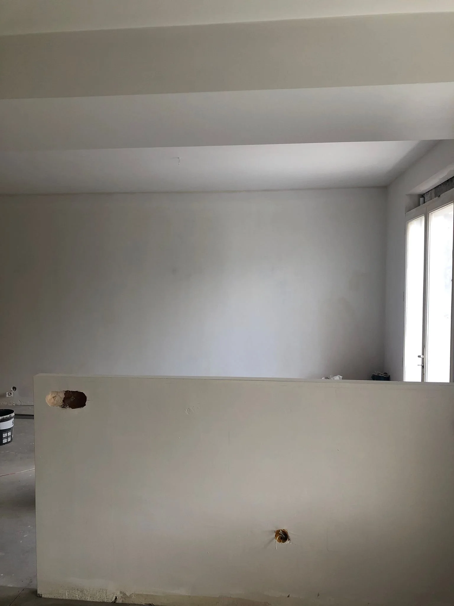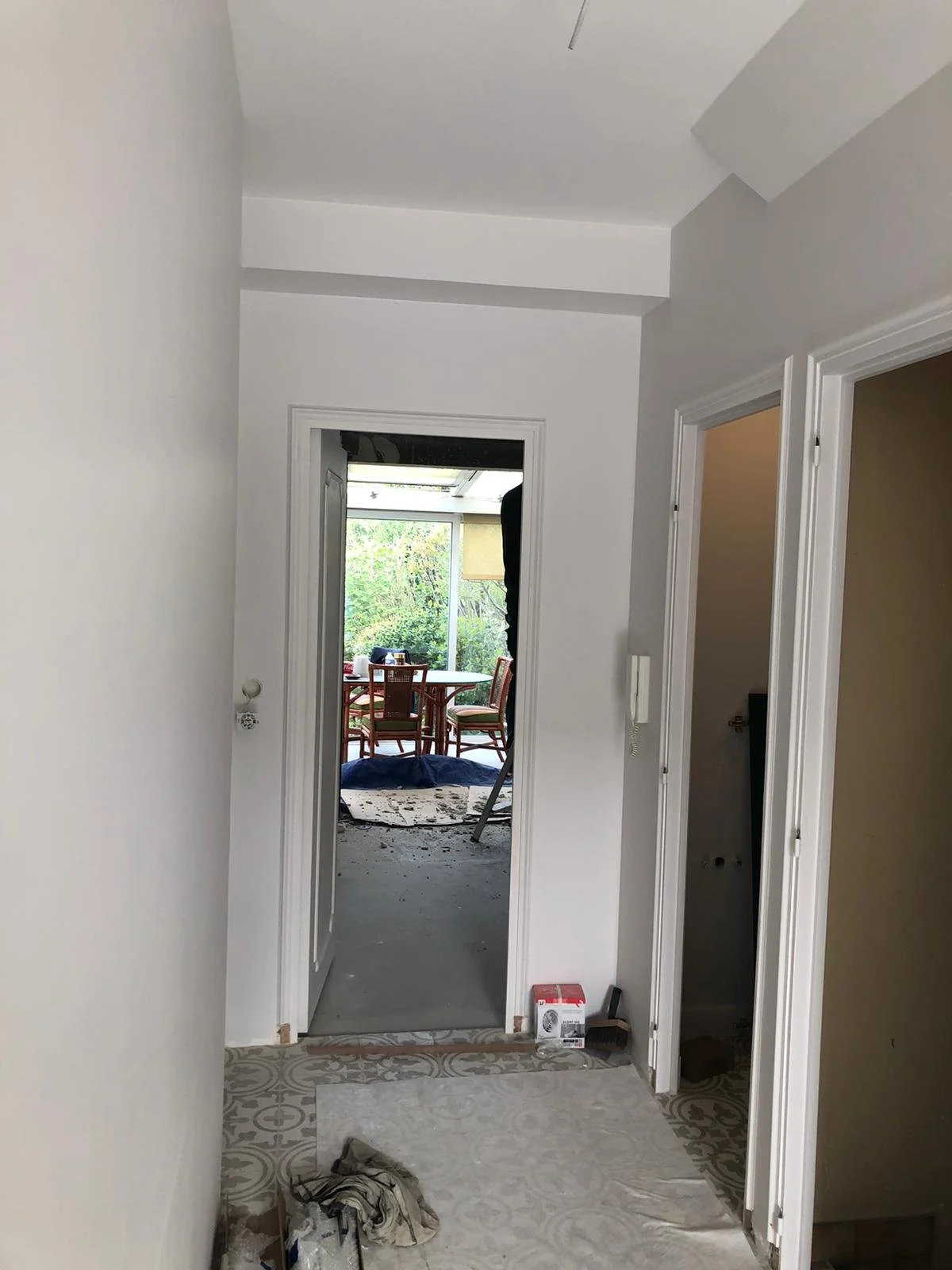 L'idée directrice a été de moderniser la maison et d'ouvrir visuellement les espaces afin d'apporter de la lumière en jouant également sur la notion de perspective pour agrandir l'ensemble. Le mobilier déjà en possession des clients a été mis en situation afin de les aider à mieux se projeter. Niveau structure, les murs de séparation de la cuisine ont été décaissés et surmontés de deux verrières. Niveau cuisine, une nouvelle implantation plus ergonomique et fonctionnelle avec un coin cuisson avec 240 cm de plan de travail, un coin évier et un coin colonne avec rangements, et électroménagers intégrés. Au niveau de la pièce de vie, l'ancien meuble désuet et imposant, a été déposé au profit d'un aménagement semi-mesure suspendu, beaucoup plus contemporain et léger visuellement, avec un travail sur les lignes verticales afin d'agrandir visuellement la HSP.